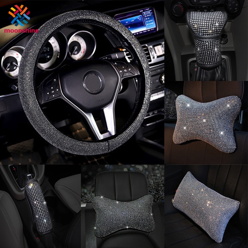Universal Rhinestone Interior Car Accessories Steering Wheel Cover Hand Brake Gear Cover or Head Pillow Waist Cushion